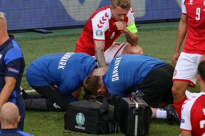 مصدومیت شدید و وحشتناک کریستین اریکسن در دقیقه ۴۴،ناگهان منجر به بیهوشی این ستاره شد.شدت مصدومیت به حدی بود که بازیکنان طاقت دیدن این صحنه را نداشتند و ورزشگاه در بهت کامل فرو رفت.