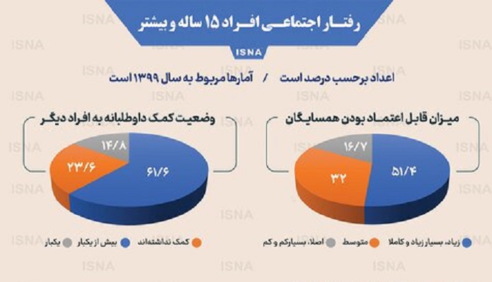 مرکز آمار ایران بر اساس داده‌های سال ۱۳۹۹ رفتار اجتماعی افراد ۱۵ ساله و بیش‌تر در کشور را در چهار بخش میزان قابل اعتماد بودن همسایگان، وضعیت کمک داوطلبانه به افراد دیگر، میزان احساس شادی در زندگی خانوادگی و احتمال کمک از طرف خویشاوندان مورد بررسی قرار داده است. در این اینفوگرفیک به نتایج این بررسی اشاره شده است.