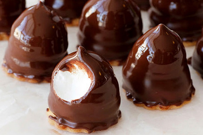 ۵- بعد از اینکه بستنیها سفت شدند، شکلات ذوب شده را حاضر کنید. بستنیهای زمستانی را روی یک سینی قرار دهید و با کمک ملاقه شکلات ذوب شده را روی آنها بریزید و کمی پودر نارگیل و گردو روی روکش بپاشید و دوباره آنها را درون یخچال قرار دهید تا روکش شکلاتی سفت شود.