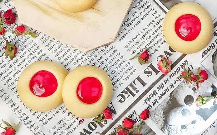 ۴ ـ خمیر را از یخچال بیرون بیاورید و دوباره داخل کاسه بریزید و کمی دیگر ورز بدهید. حالا خمیر را روی میز کار به صورت یک‌نواخت و با قطر حدودا ۳ تا ۴ سانت باز کنید و با قالب‌های مخصوص شیرینی مانند قالب گل یا قلب قالب بزنید. اگر قالب نداشتید، از خمیر به اندازه گردو بردارید و گرد کنید؛ سپس وسط آن را با انگشت فشار بدهید تا حفره کوچکی وسط شیرینی شکل بگیرد. کف سینی فر را کاغذ روغنی پهن کنید و شیرینی‌ها را روی سینی فر بچینید. سینی فر را در فر ۱۷۵ درجه سانتیگراد به مدت ۱۵ دقیقه در طبقه وسط بگذارید.
