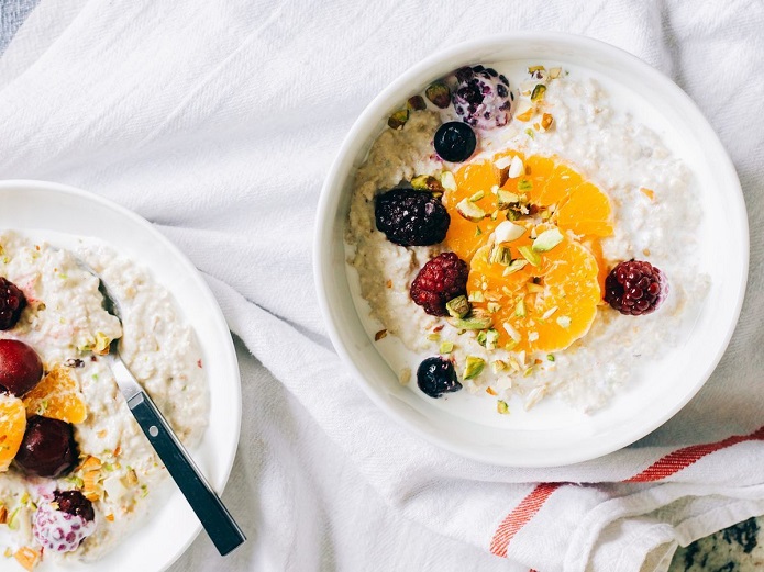 ۴. مقداری از مواد را در کاسهای ریخته و آن را با شیر یا شیر سویا مخلوط کنید. میوههای تازه فصلی مانند توت فرنگی، موز، سیب یا هر میوهای که میل دارید را خرد کنید و روی آن بریزید. صبحانه سوئیسی شما آماده است.