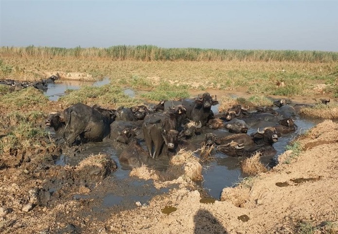گاومیشهایی که در دمای ۵۰ درجهی خوزستان مرگ و زندگیشان به آب وصل است در لجنزاری از آخرین قسمتهای بازماندهی تالابِ بیآب هورالعظیم دست و پا میزنند. ویدئو را محیطبان سید باقر موسوی در ظهر امروز ۱۶ تیر ۱۴۰۰ گرفته است.