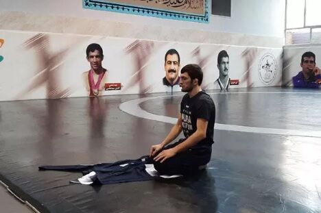 دو قهرمان روس کشتی جهان پیش از شروع مسابقات نیمه نهایی لیگ برتر ایران، نماز خود را در سالن تمرین به جا آوردند.