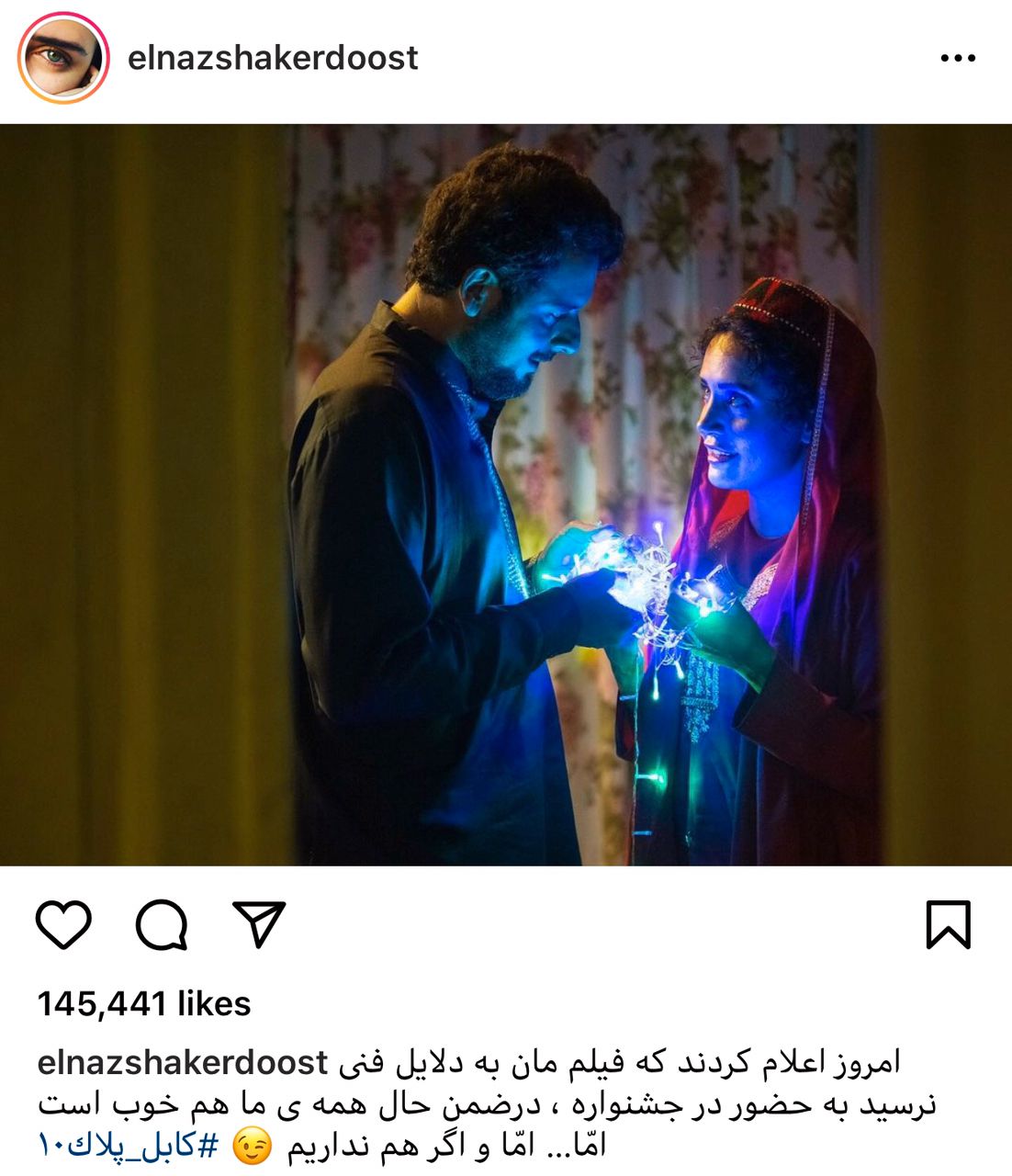 الناز شاکردوست بازیگر سینمای کشورمان در پی نرسیدن فیلم کابل شماره ۱۰ به جشنواره فیلم فجر در پستی اینستاگرامی به این موضوع واکنش نشان داد.