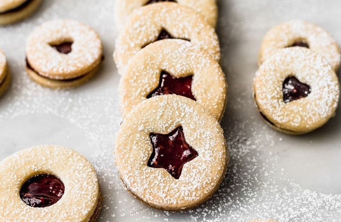 ۵. وسط شیرینیهای ساده و خالی نشده مقداری مارمالاد یا ژله مغزی میریزیم. شیرینیهای ساده را در زیر و شیرینی حفرهدار تزیینشده را روی قسمت زیری قرار دهید تا شیرینیها جفت شوند.