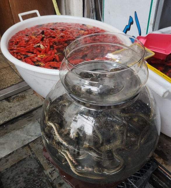 جامعه ۲۴- امروز دربازارچه شاپور مار آبی در کنار ماهی قرمز در نبود نظارت سازمان محیط زیست به راحتی خرید و فروش میشد.